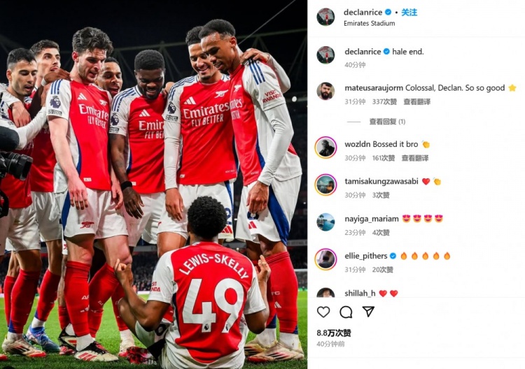 赖斯也在赛后通过社媒晒出自己和队友们围观小将斯凯利打坐庆祝的照片,并配文:“黑尔恩德。”